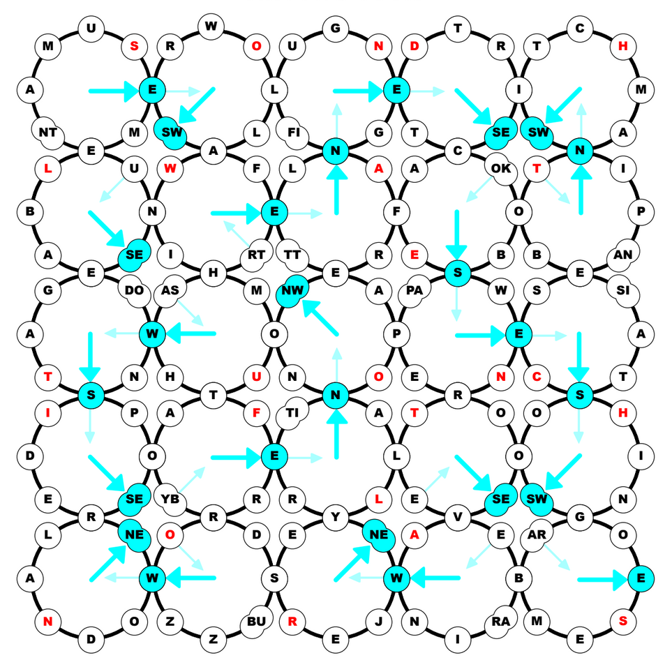 Clues with with (+) are entered clockwise; clues with (-) are entered widdershins. When the diagram is filled, one cell of each ring has a letter (or letters) corresponding to the compass direction of the cell: